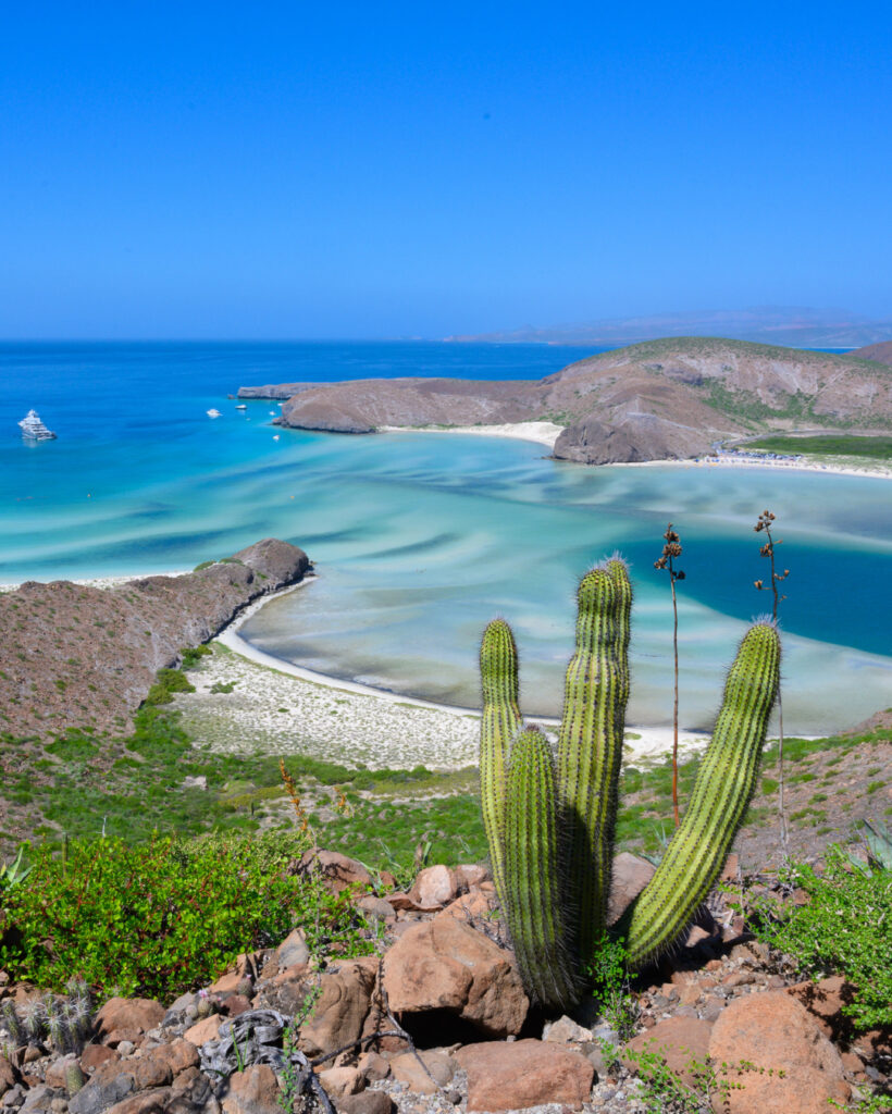 A medida que el camino se acerca al lado este de la península, el Mar de Cortés —apodado por Jacques Cousteau como “el acuario del mundo”— comienza a asomarse. Esta etapa de la ruta es visualmente impactante, con el azul profundo del agua que contrasta con las montañas rojizas.