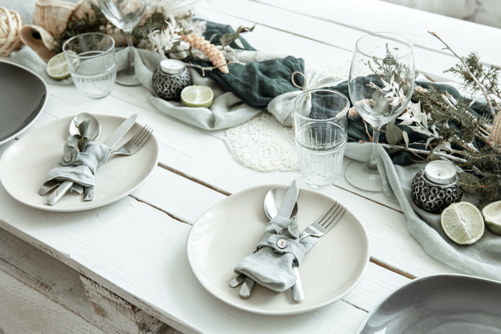 Cómo integrarlos: elige un color profundo como base y equilibra con tonos neutros. Por ejemplo, un mantel azul marino con platos claros y detalles en verde oliva, o una mesa en tonos beige con acentos burdeos estratégicamente colocados.