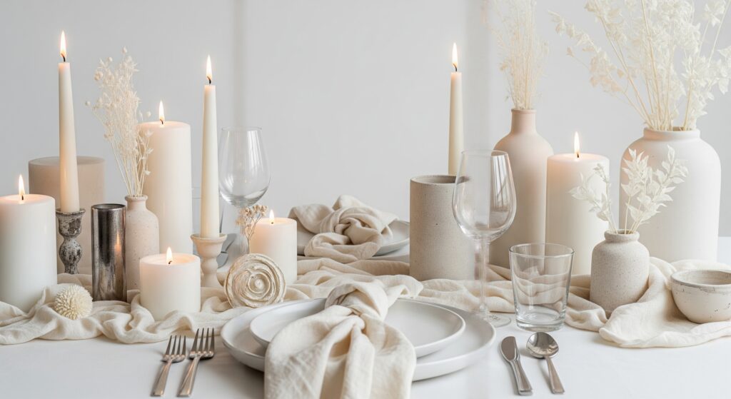 La clave está en evitar la monotonía mediante capas: blancos rotos, marfil, perla y alabastro conviven para aportar profundidad visual. Los detalles metálicos en plata envejecida o un tono dorado muy suave pueden incorporarse con discreción, así como elementos naturales blanqueados, como ramas secas o flores preservadas.
