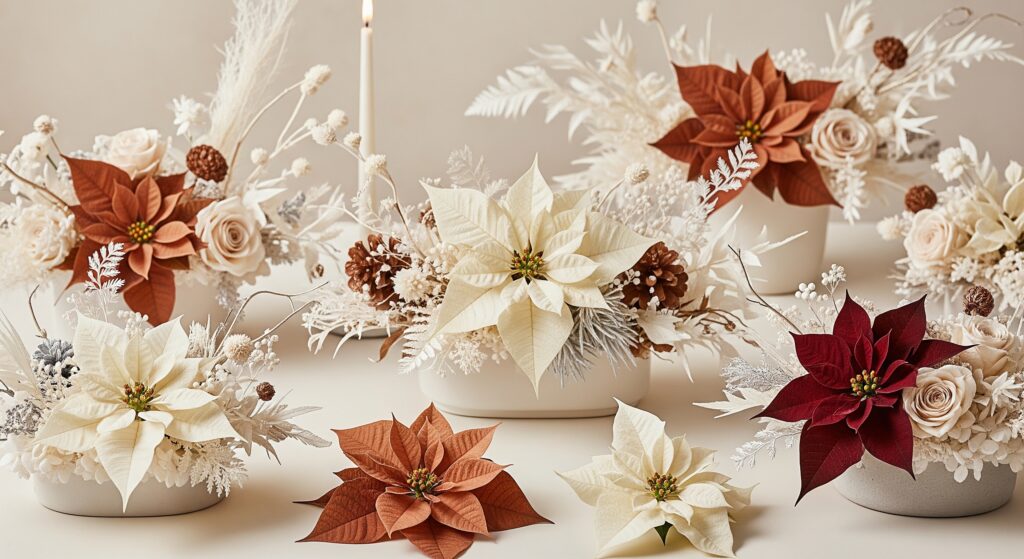 En este relato visual, la flor de Nochebuena ocupa un lugar especial. Emblema natural de la Navidad mexicana, en 2025 se presenta desde una mirada más contemporánea: arreglos orgánicos, composiciones asimétricas y paletas que se alejan del rojo tradicional para explorar versiones en marfil, blush, terracota o burdeos profundo. Integrada de forma sutil —en centros de mesa bajos, pequeños acentos entre follaje o incluso como flor individual—, la nochebuena aporta identidad, tradición y una conexión emocional inmediata.