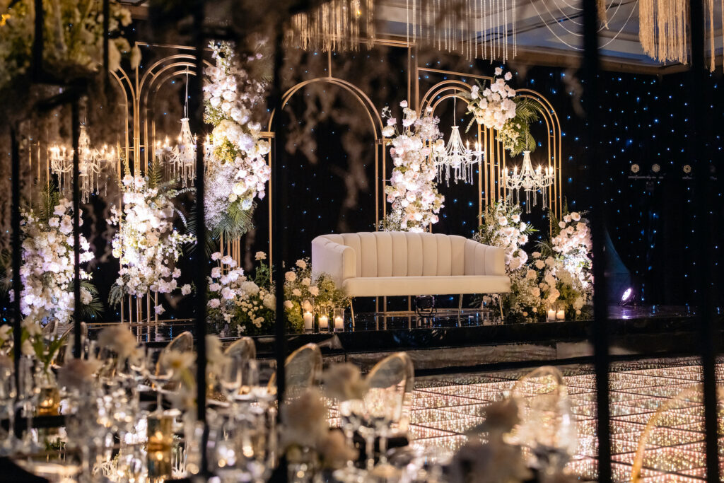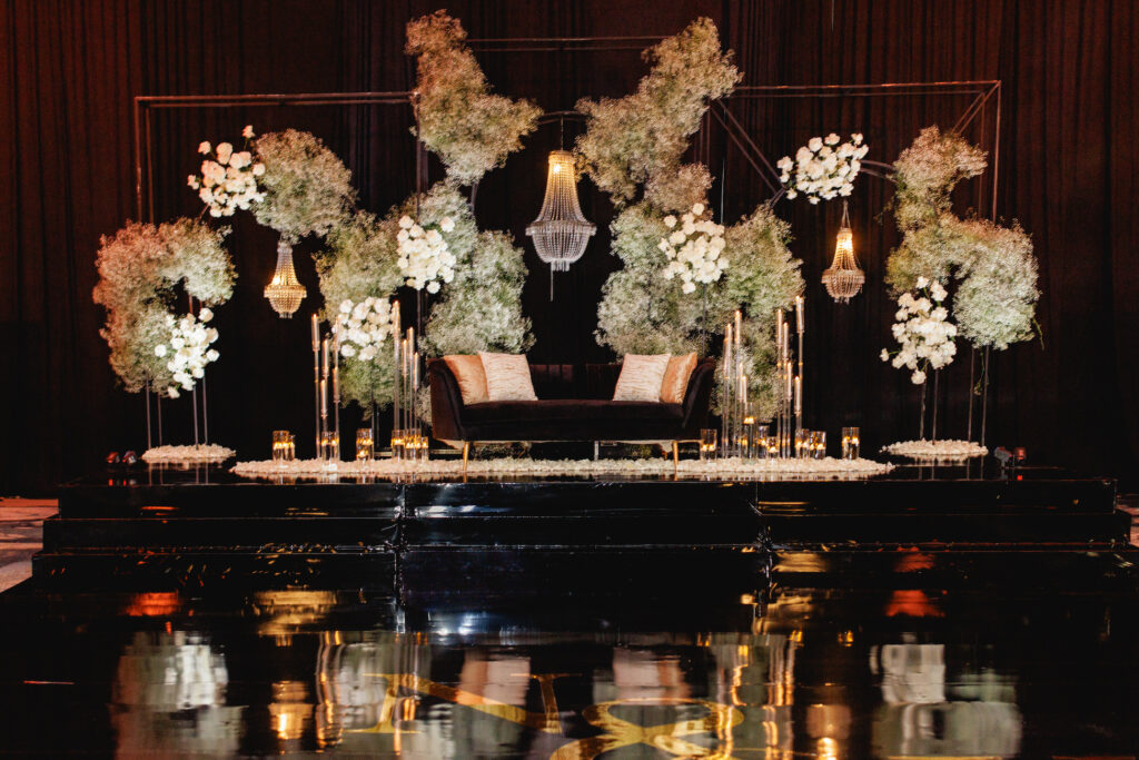 - Calidez en tu diseño: para evitar que un gran salón se perciba frío, utiliza elementos de “alto impacto”. Te recomendamos arreglos florales arquitectónicos y textiles de gran riqueza visual para aportar la calidez e intimidad que tu evento merece.