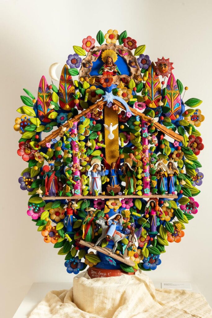 • Microcosmos de vida: flores de barro, aves, mariposas y frutos cuelgan de alambres casi invisibles, otorgando a la pieza una sensación de movimiento y abundancia.