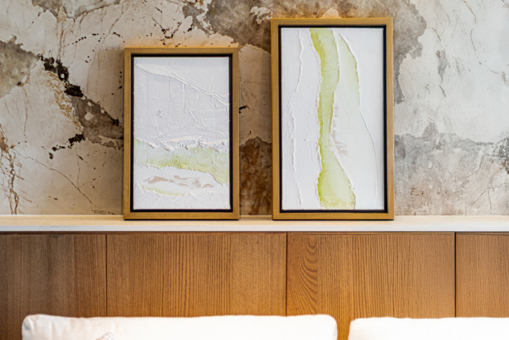 - Piedra pulida y paneles de madera que anclan el espacio con una calidez orgánica.